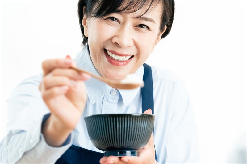 食事の最初に水分を含んだ食材を選ぶことで、口の中が潤いやすくなり、飲み込みやすくなります。